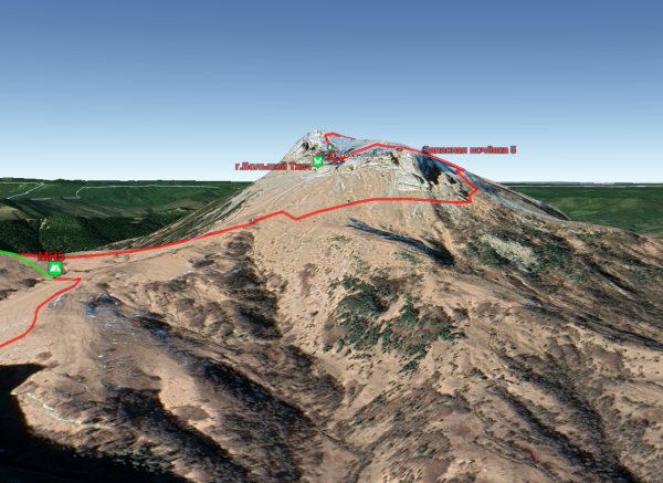 Направление перехода:Без рюкзаков начать восхождение с юга-запада от вершины по тропе с высоты 2166м от точки (43.59067 040.33003)